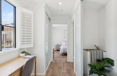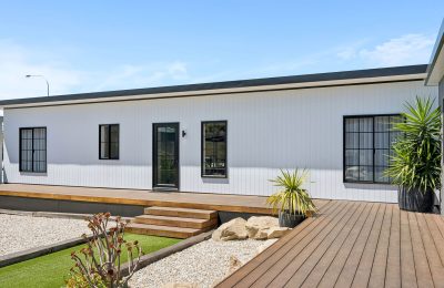 From the outside, Clover’s clean lines create an immediate sense of calm. Step inside and you’ll find a cleverly planned layout that feels open, bright and unexpectedly spacious. Two well-sized bedrooms sit at opposite ends of the home for privacy, while the generous central living zone brings everyone together with an effortless flow between the kitchen, dining and lounge.